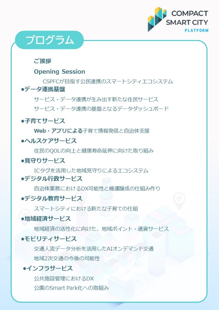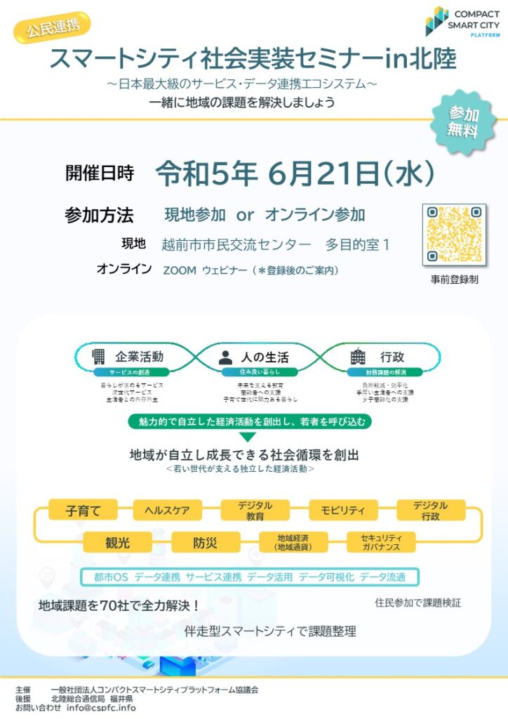 大阪府豊能町、福井県、茨城県笠間市でのスマートシティ事業における2022年度CSPFC活動・成果の報告をするとともに、福井県をはじめとする北陸地方でのスマートシティ推進を図るため、スマートシティに対する理解促進、データ連携基盤であるコンパクトスマートシティプラットフォーム(CSPF)の概要、公民連携の枠組み形成支援。提供サービスについて、CSPFC会員企業から紹介することを目的にスマートシティを推進する自治体、企業等を対象にセミナーを開催します。